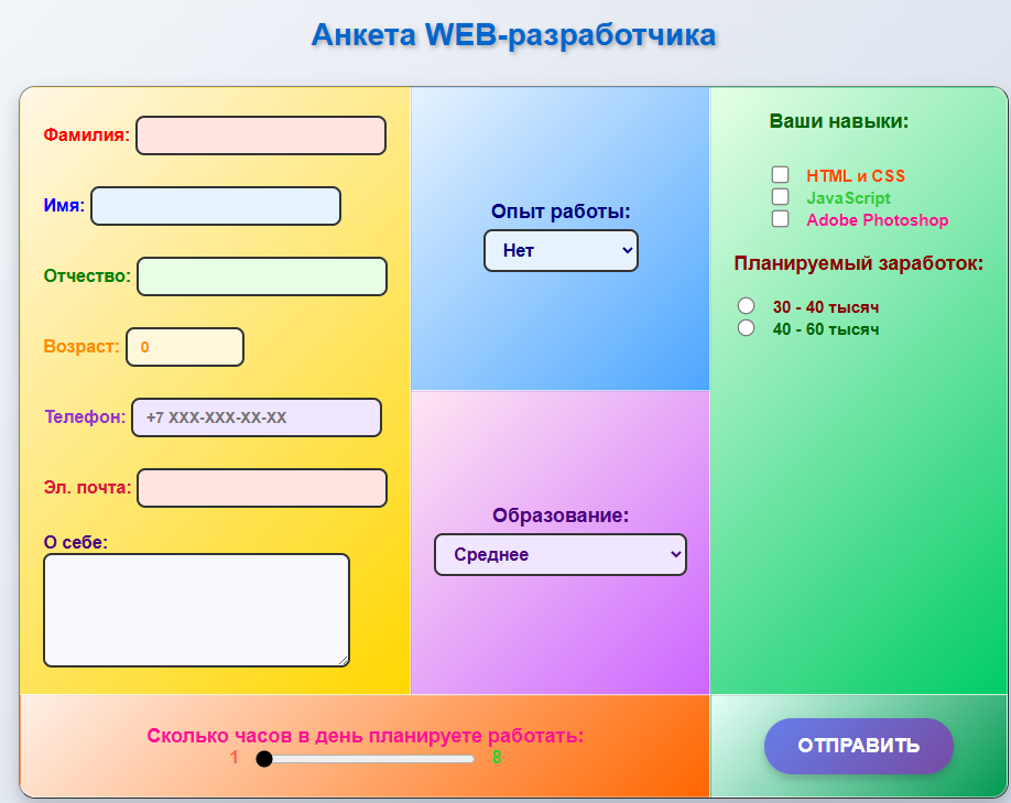 Главная » Учебные материалы » WEB-технологии » Домашние задания » ИДДО НИУ «МЭИ» » Несколько классов/семестров » Номер КМ-2 » Вариант 12 » КМ-2. Основы каскадных таблиц стилей - CSS. Спецсимволы в HTML. Вариант Анкета WEB-разработчика