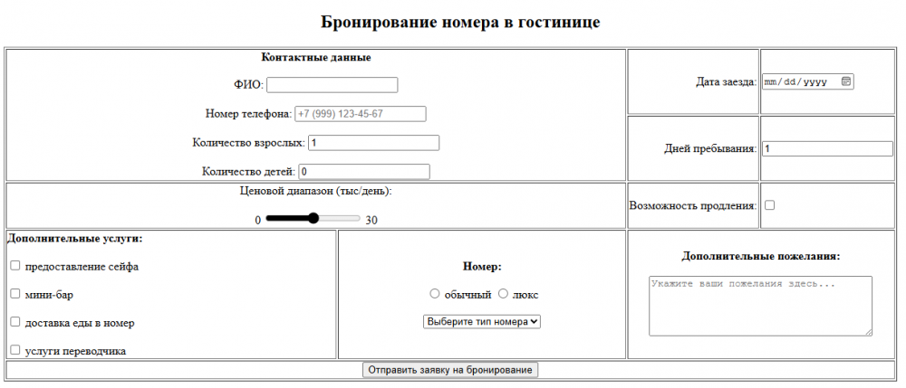 КМ-1. Основы языка разметки HTML - элементы форматирования html-страницы, таблицы, фреймы, формы. Вариант 20 Бронирование номера в гостинице