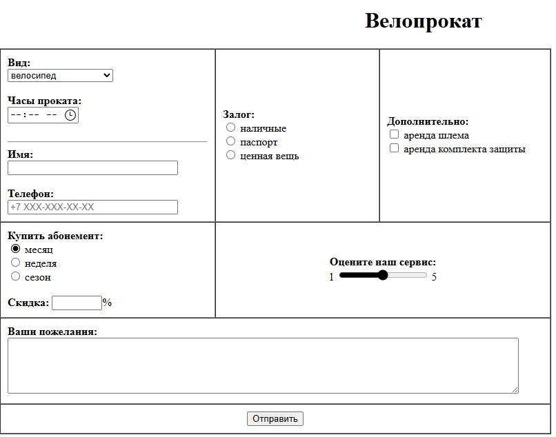 ДЗ КМ-1: КМ-1. Основы языка разметки HTML - элементы форматирования html-страницы, таблицы, фреймы, формы. Вариант 18 Велопрокат