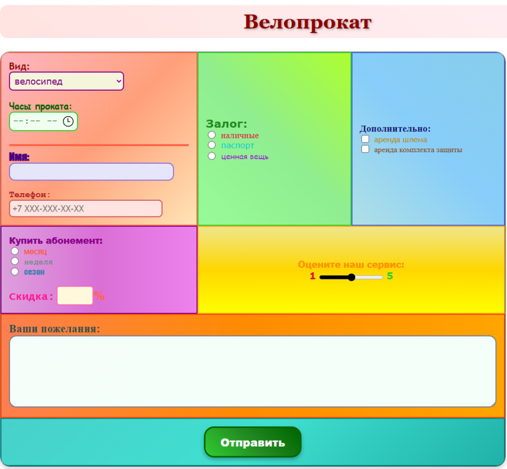 Главная » Учебные материалы » WEB-технологии » Домашние задания » ИДДО НИУ «МЭИ» » Несколько классов/семестров » Номер КМ-2 » Вариант 18 » КМ-2. Основы каскадных таблиц стилей - CSS. Спецсимволы в HTML. Вариант Велопрокат