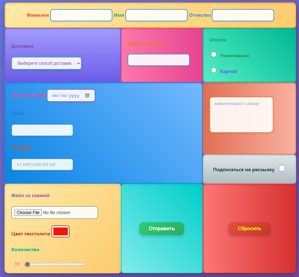 2. Конструкции CSS-файла должны предусматривать возможность изменения РАЗМЕРА и ЦВЕТА фонтов (семейство фонтов - на ваше усмотрение) ВСЕХ надписей HTML-страницы, а также ВСЕХ полей ввода и выбора (text, select, data и т.п. ) в форме HTML-страницы. Это значит, что при проверке работы должна иметься возможность менять только размеры фонтов и цвет без вставки дополнительного кода в CCS-файл.