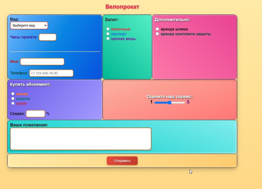 Главная » Учебные материалы » WEB-технологии » Домашние задания » ИДДО НИУ «МЭИ» » Несколько классов/семестров » Номер КМ-2 » Вариант 18 » КМ-2. Основы каскадных таблиц стилей - CSS. Спецсимволы в HTML. Вариант 18 Велопрокат