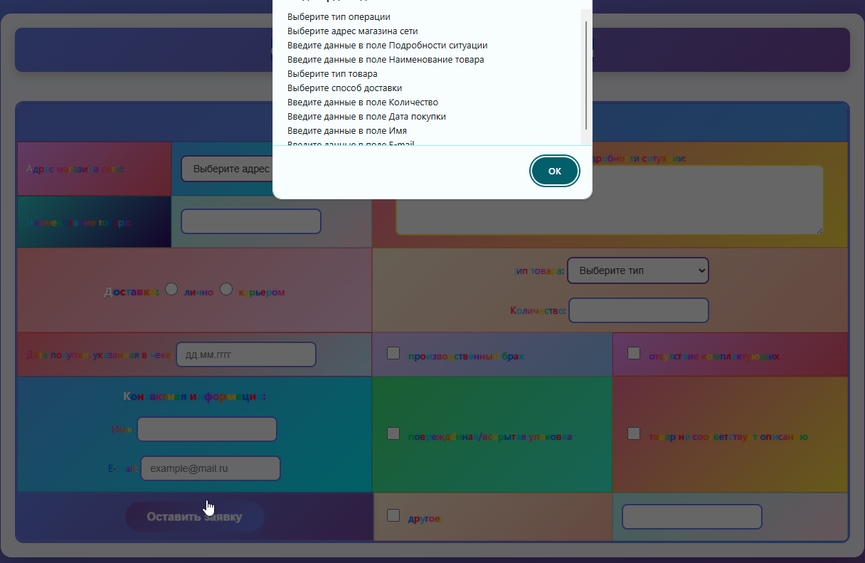 3. С помощью конструкций языка jаvascript (а не HTML 5), проверять ввод данных и блокировать передачу их на сервер в случае обнаружения некорректных данных: пустые поля text, некорректные значения в поле где должно быть число и невыбранные radio и select. Выводить в окно браузера соответствующее сообщение (например, 'Введите корректное значение в поле Цена' или 'Введите данные в поле ФИО'). Выводить сообщение можно только одно, о первой обнаруженной некорректности с указанием конкретного поля или можно объединить все поля с некорректными данными в одном сообщении. Если все данные введены корректно, должно появиться окно данных, переданных на сервер (как в предыдущих работах).