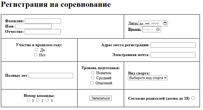 КМ-1. Основы языка разметки HTML - элементы форматирования html-страницы, таблицы, фреймы, формы. Вариант 7 Регистрация на соревнование шаб