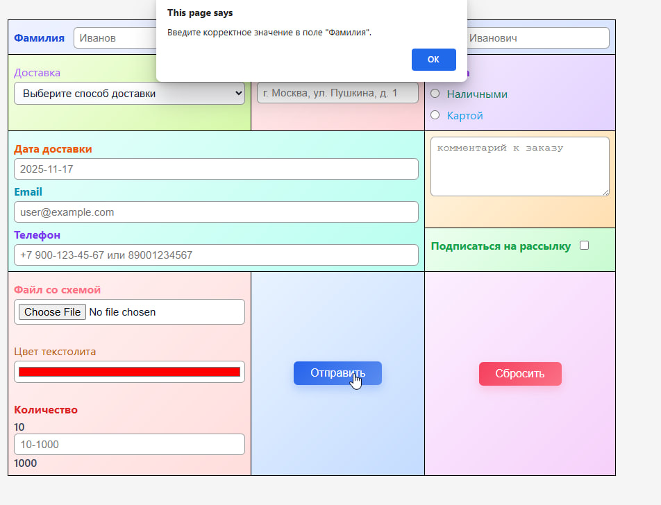 3. С помощью конструкций языка jаvascript (а не HTML 5), проверять ввод данных и блокировать передачу их на сервер в случае обнаружения некорректных данных: пустые поля text, некорректные значения в поле где должно быть число и невыбранные radio и select. Выводить в окно браузера соответствующее сообщение (например, 'Введите корректное значение в поле Цена' или 'Введите данные в поле ФИО'). Выводить сообщение можно только одно, о первой обнаруженной некорректности с указанием конкретного поля или можно объединить все поля с некорректными данными в одном сообщении. Если все данные введены корректно, должно появиться окно данных, переданных на сервер (как в предыдущих работах).