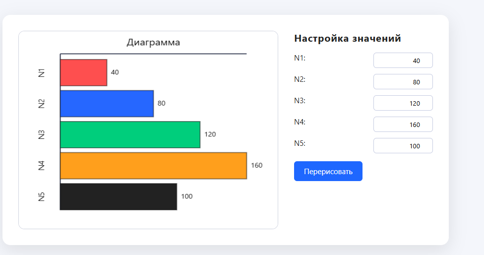 с помощью конструкций jаvascript и CANVAS, нарисовать диаграмму, размещенную ниже. Значения высоты (длины) столбцов должны задаваться в отдельных полях ввода, размещенных произвольно в текущем окне браузера (там же, где и диаграмма). Все надписи на диаграмме обязательны.