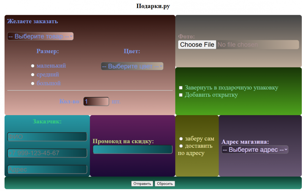 Для студентов ИДДО НИУ «МЭИ» по предмету WEB-технологииДЗ КМ-3: КМ-3. Основы JavaScript - обработка событий, проверка ввода данных в форму. Вариант 14 Подарки.руДЗ КМ-3: КМ-3. Основы JavaScript - обработка событий, проверка ввода данных в форму. Вариант 14 Подарки.ру