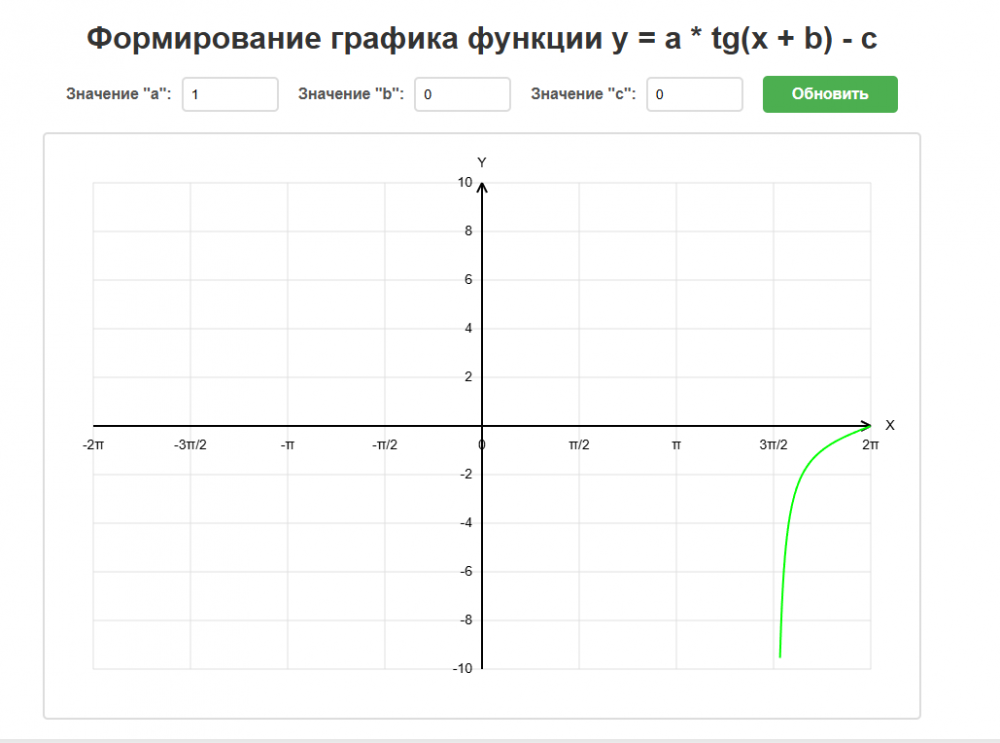 Задание: Задание на Письменную работу № 4: с помощью конструкций jаvascript и CANVAS, нарисовать график функции y=a*tg(x+b)-c Коэффициенты a, b и c должны задаваться в отдельных полях ввода, размещенных произвольно в текущем окне браузера (там же, где и график). На размещенном ниже рисунке приведен некий пример того, как может выглядеть координатная сетка и график на ней. Числовые значения координатной сетки могут изменяться по вашему желанию. Не забывайте, что у вас в задании другая функция и график будет выглядеть иначе.