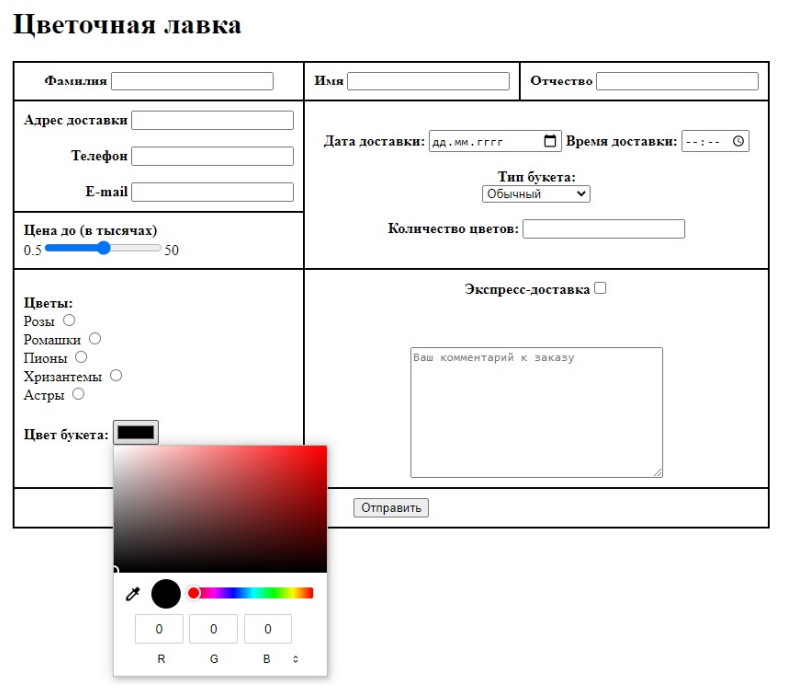 выводиться в окно браузера. Если, например, выбирается цвет и выбран