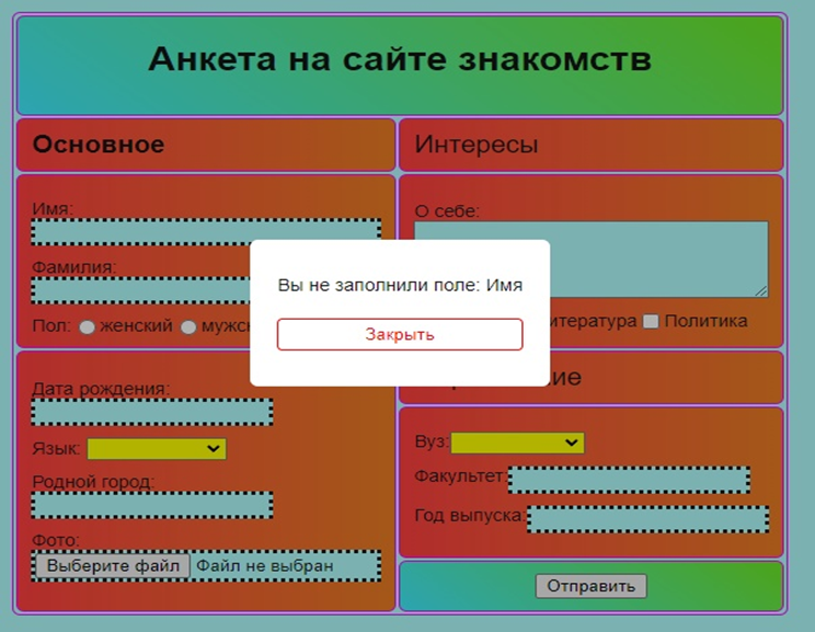 3. С помощью конструкций языка jаvascript (а не HTML 5), проверять ввод данных и блокировать передачу их на сервер в случае обнаружения некорректных данных: пустые поля text, некорректные значения в поле где должно быть число и невыбранные radio и select. Выводить в окно браузера соответствующее сообщение (например, 'Введите корректное значение в поле Цена' или 'Введите данные в поле ФИО'). Выводить сообщение можно только одно, о первой обнаруженной некорректности с указанием конкретного поля или можно объединить все поля с некорректными данными в одном сообщении. Если все данные введены корректно, должно появиться окно данных, переданных на сервер (как в предыдущих работах).