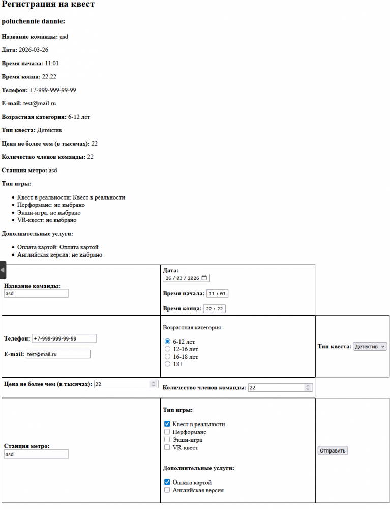Главная » Учебные материалы » WEB-технологии » Домашние задания » ИДДО НИУ «МЭИ» » Номер КМ-6 » Вариант Регистрация на квест » КМ-6. Передача параметров между сценариями (скриптами) PHP. Отправка данных на сервер с помощью форм. Вариант Регистрация на квест