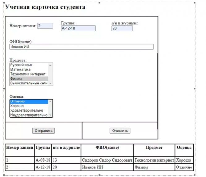 Задание: На базе формы, использованной в работах № 1 и 2, pазработать web-приложение для отправки данных на сервер, записи их в базу данных (используется MySQL/MariaDB) и вывод данных на экран в табличном виде.