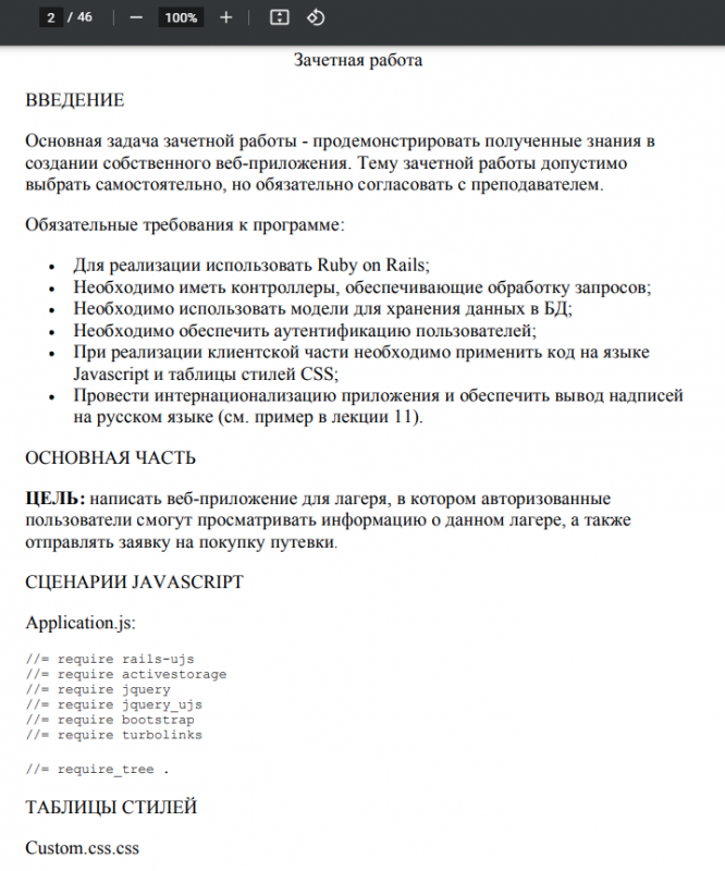Основная задача зачетной работы - продемонстрировать полученные знания в создании собственного веб-приложения. Тему зачетной работы допустимо выбрать самостоятельно, но обязательно согласовать с преподавателем. Обязательные требования к программе: • Для реализации использовать Ruby on Rails; • Необходимо иметь контроллеры, обеспечивающие обработку запросов; • Необходимо использовать модели для хранения данных в БД; • Необходимо обеспечить аутентификацию пользователей; • При реализации клиентской части необходимо применить код на языке jаvascript и таблицы стилей CSS; • Провести интернационализацию приложения и обеспечить вывод надписей на русском языке (см. пример в лекции 11).