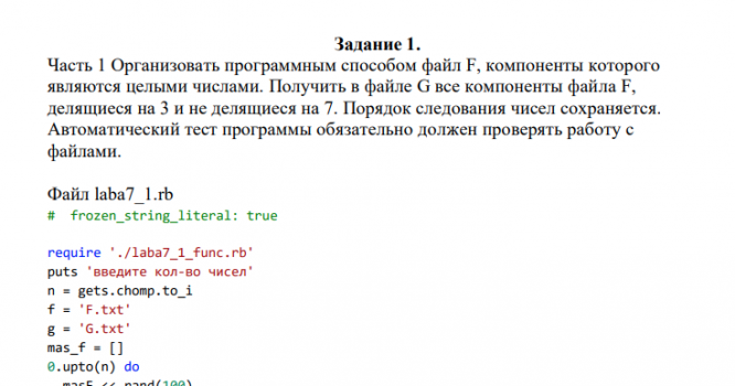Часть 1 Организовать программным способом файл F, компоненты которого являются целыми числами. Получить в файле G все компоненты файла F, делящиеся на 3 и не делящиеся на 7. Порядок следования чисел сохраняется. Автоматический тест программы обязательно должен проверять работу с файлами.
