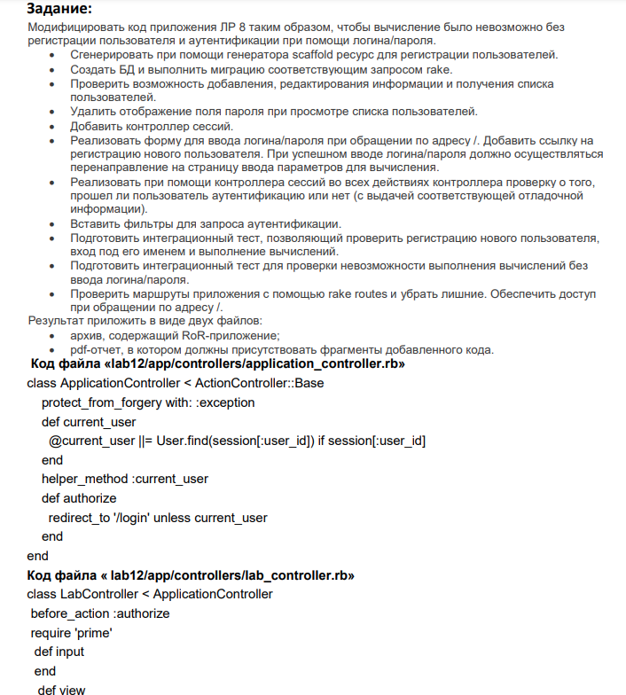 Модифицировать код приложения ЛР 8 таким образом, чтобы вычисление было невозможно без регистрации пользователя и аутентификации при помощи логина/пароля.  Сгенерировать при помощи генератора scaffold ресурс для регистрации пользователей.  Создать БД и выполнить миграцию соответствующим запросом rake.  Проверить возможность добавления, редактирования информации и получения списка пользователей.  Удалить отображение поля пароля при просмотре списка пользователей.  Добавить контроллер сессий.  Реализовать форму для ввода логина/пароля при обращении по адресу /. Добавить ссылку на регистрацию нового пользователя. При успешном вводе логина/пароля должно осуществляться перенаправление на страницу ввода параметров для вычисления.  Реализовать при помощи контроллера сессий во всех действиях контроллера проверку о того, прошел ли пользователь аутентификацию или нет (с выдачей соответствующей отладочной информации).  Вставить фильтры для запроса аутентификации.  Подготовить интеграционный тест, позволяющий проверить регистрацию нового пользователя, вход под его именем и выполнение вычислений.  Подготовить интеграционный тест для проверки невозможности выполнения вычислений без ввода логина/пароля.  Проверить маршруты приложения с помощью rake routes и убрать лишние. Обеспечить доступ при обращении по адресу /. Результат приложить в виде двух файлов:  архив, содержащий RoR-приложение;  pdf-отчет, в котором должны присутствовать фрагменты добавленного кода.