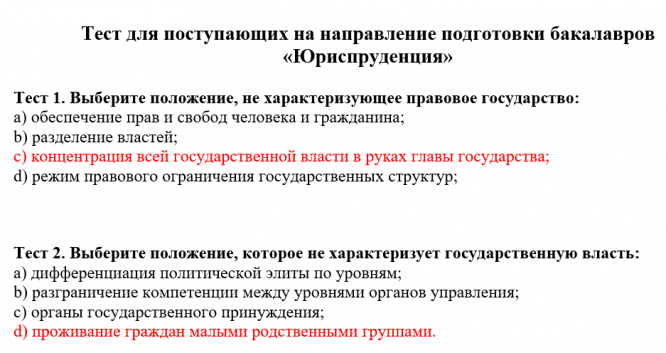 Ответы к контрольной работе: Тест для поступающих на направление подготовки бакалавров «Юриспруденция»