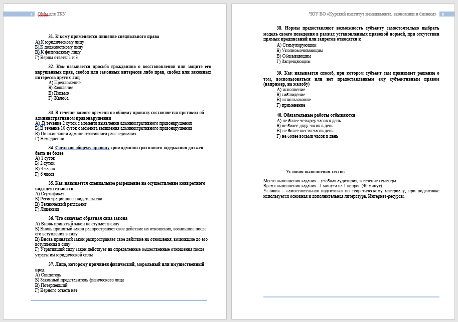 Что относится к обстоятельствам, которые смягчают административную ответственность А) Раскаяние лица, которое совершило административное правонарушение Б) Совершение административного правонарушения в состоянии эффекта В) Совершение административного правонарушения в состоянии алкогольного опьянения Г) Повторное совершение административного правонарушения 30. На какой срок назначается лишение специального права А) От 1 месяца до 3 лет Б) От 6 месяцев до 3 лет В) От 3 месяцев до 2 лет Г) Верного ответа нет 31. К кому применяется лишение специального права А) К юридическому лицу Б) К должностному лицу В) К физическому лицу Г) Верны ответы 1 и 3 32. Как называется просьба гражданина о восстановлении или защите его нарушенных прав, свобод или законных интересов либо прав, свобод или законных интересов других лиц А) Предложение Б) Заявление В) Письмо Г) Жалоба 33.