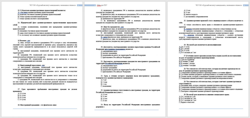 Административная ответственность иностранных граждан, на территории Российской Федерации наступает с: А) 14 лет Б) 10 лет В) 16 лет Г) 18 лет 24. Въезд на территорию Российской Федерации иностранным гражданам разрешен с: А) 14 лет Б) 10 лет В) любого возраста Г) достижением совершеннолетия 25. Административно-правовой статус индивидуального субъекта включает в себя: А) только способность иметь права и обязанности административно-правового характера Б) правила поведения индивидуальных субъектов в общественных местах В) правовое положение индивидуальных субъектов в отношениях с субъектами исполнительной власти, урегулированное нормами административного права Г) правовое положение индивидуальных субъектов с момента достижения возраста совершеннолетия в отношениях с субъектами исполнительной власти, урегулированное нормами административного права 26.