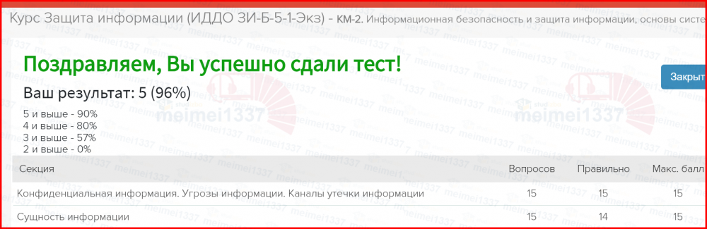 Для студентов ИДДО НИУ «МЭИ» по предмету Защита информацииКМ-2. Информационная безопасность и защита информации, основы системы информационной безопасности. Тестирование - 96%КМ-2. Информационная безопасность и защита информации, основы системы информационной безопасности. Тестирование - 96%