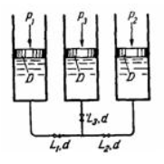 Задача (Куколевский И.И.) 10-30. Три одинаковых цилиндра диаметром О =50 мм заполнены маслом (б = 0,88, v = 0,3 см2/сек) и соединены трубами L1=L2= 22,5 м, L3 = 20 м и d = 25 мм. На поверхностях масла в цилиндрах помещены поршни, нагруженные силами Р1 = 700 Н, Р2 = 640 Н, Р3 = 500 Н. Определить направления и величины скоростей перемещения поршней. Пренебречь высотами расположения поршней относительно узловой точки системы.