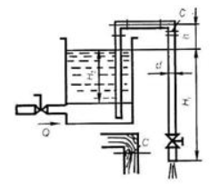 Задача (Куколевский И.И.) 9.5. Определить максимальный расход Q воды, который можно подавать в бак, снабженный сифонной сливной трубой диаметром d = 100 мм и общей длиной L = 10м, если выходное сечение трубы ниже предельного уровня в баке на Н1 = 4 м. Труба имеет два сварных колена (? = 1,3) и вентиль (? = 6,9). Коэффициент сопротивления входа в трубу ?вх = 0,5. Коэффициент сопротивления трения ? = 0,025. Определить вакуум Pв в сечении С, если это сечение выше предельного уровня на h = 1,5 м и длина участка трубы до него Каков будет вакуум в этом сечении, когда уровень в баке понизится на H2 = 2 м? ![]()
