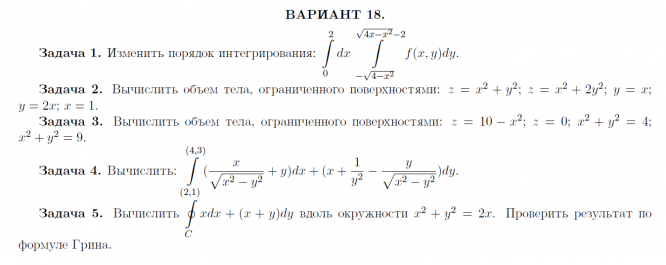 ВАРИАНТ 18. Задача 1. Изменить порядок интегрирования: Z 2 0 dx √ 4xZ−x2−2 − √ 4−x2 f(x, y)dy. Задача 2. Вычислить объем тела, ограниченного поверхностями: z = x 2 + y 2 ; z = x 2 + 2y 2 ; y = x; y = 2x; x = 1. Задача 3. Вычислить объем тела, ограниченного поверхностями: z = 10 − x 2 ; z = 0; x 2 + y 2 = 4; x 2 + y 2 = 9. Задача 4. Вычислить: (4,3) Z (2,1) ( x p x 2 − y 2 + y)dx + (x + 1 y 2 − y p x 2 − y 2 )dy. Задача 5. Вычислить I C xdx + (x + y)dy вдоль окружности x 2 + y 2 = 2x. Проверить результат по формуле Грина.