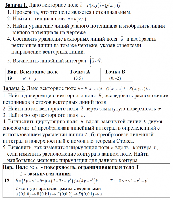 ТЕОРИЯ ПОЛЯ. Задача 1. Дано векторное поле 1. Проверить, что это поле является потенциальным. 2. Найти потенциал поля 3. Найти уравнение линий равного потенциала и изобразить линии равного потенциала на чертеже. 4. Составить уравнение векторных линий поля и изобразить векторные линии на том же чертеже, указав стрелками направление векторных линий. 5. Вычислить линейный интеграл . Задача 2. Дано векторное поле . 1. Найти дивергенцию векторного поля , исследовать расположение источников и стоков векторных линий поля. 2. Найти поток векторного поля через замкнутую поверхность . 3. Найти ротор векторного поля . 4. Вычислить циркуляцию поля вдоль замкнутой линии двумя способами: а) преобразовав линейный интеграл в определенный с использованием уравнений линии ; б) преобразовав линейный интеграл в поверхностный с помощью теоремы Стокса.