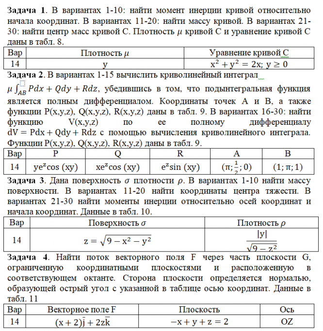 Задача 1. В вариантах 1-10: найти момент инерции кривой относительно начала координат. В вариантах 11-20: найти массу кривой. В вариантах 21-30: найти центр масс кривой С. Плотность кривой С и уравнение кривой С даны в табл. 8. Задача 2. В вариантах 1-15 вычислить криволинейный интеграл , убедившись в том, что подынтегральная функция является полным дифференциалом. Координаты точек Aи B, а также функции P(x,y,z), Q(x,y,z), R(x,y,z) даны в табл. 9. В вариантах 16-30: найти функцию V(x,y,z) по ее полному дифференциалу с помощью вычисления криволинейного интеграла. Функции P(x,y,z), Q(x,y,z), R(x,y,z) даны в табл. 9. Задача 3.