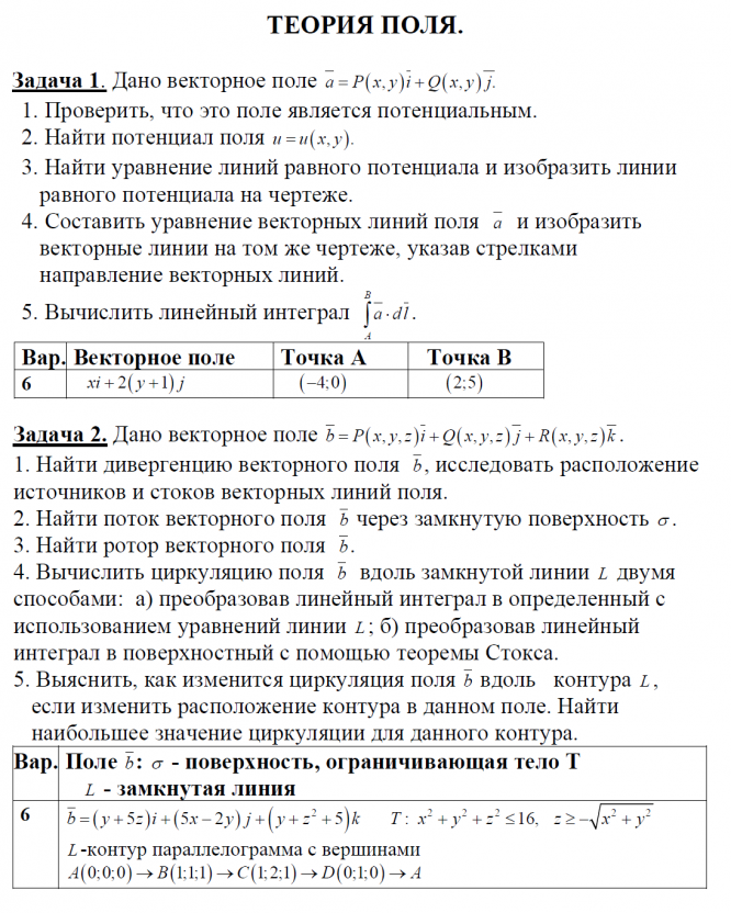 ТЕОРИЯ ПОЛЯ. Задача 1. Дано векторное поле 1. Проверить, что это поле является потенциальным. 2. Найти потенциал поля 3. Найти уравнение линий равного потенциала и изобразить линии равного потенциала на чертеже. 4. Составить уравнение векторных линий поля и изобразить векторные линии на том же чертеже, указав стрелками направление векторных линий. 5. Вычислить линейный интеграл . Задача 2. Дано векторное поле . 1. Найти дивергенцию векторного поля , исследовать расположение источников и стоков векторных линий поля. 2. Найти поток векторного поля через замкнутую поверхность . 3. Найти ротор векторного поля . 4. Вычислить циркуляцию поля вдоль замкнутой линии двумя способами: а) преобразовав линейный интеграл в определенный с использованием уравнений линии ; б) преобразовав линейный интеграл в поверхностный с помощью теоремы Стокса.