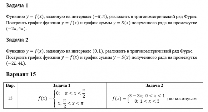 Задача 1 Функцию y=f(x), заданную на интервале (-π,π), разложить в тригонометрический ряд Фурье. Построить график функции y=f(x) и график суммы y=S(x) полученного ряда на промежутке (-2π,4π). Задача 2 Функцию y=f(x), заданную на интервале (0,L), разложить в тригонометрический ряд Фурье. Построить график функции y=f(x) и график суммы y=S(x) полученного ряда на промежутке (-2L,4L). Вариант 15 Вар.Задача 1Задача 2 15f(x)={█(0; -π<x<π/2@x; π/2<x<π)┤f(x)={█(3-3x; 0<x<1@0; 1<x<3)┤ ;по косинусам .