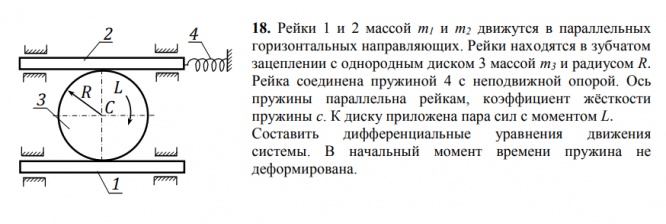 18. Рейки 1 и 2 массой m1 и m2 движутся в параллельных горизонтальных направляющих. Рейки находятся в зубчатом зацеплении с однородным диском 3 массой m3 и радиусом R. Рейка соединена пружиной 4 с неподвижной опорой. Ось пружины параллельна рейкам, коэффициент жёсткости пружины c. К диску приложена пара сил с моментом L. Составить дифференциальные уравнения движения системы. В начальный момент времени пружина не деформирована. .
