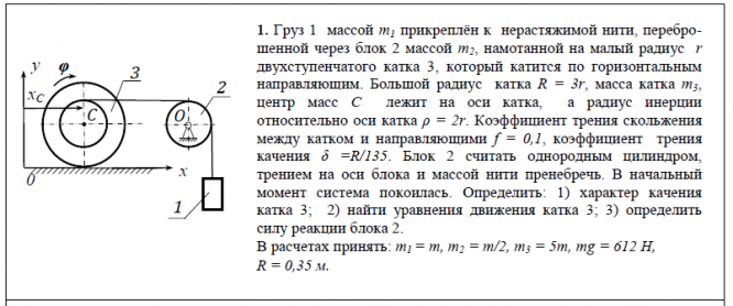 1. Груз 1 массой m1 прикреплён к нерастяжимой нити, переброшенной через блок 2 массой m2, намотанной на малый радиус r двухступенчатого катка 3, который катится по горизонтальным направляющим. Большой радиус катка R = 3r, масса катка m3, центр масс C лежит на оси катка, а радиус инерции относительно оси катка ρ = 2r. Коэффициент трения скольжения между катком и направляющими f = 0,1, коэффициент трения качения δ =R/135. Блок 2 считать однородным цилиндром, трением на оси блока и массой нити пренебречь. В начальный момент система покоилась. Определить: 1) характер качения катка 3; 2) найти уравнения движения катка 3; 3) определить силу реакции блока 2. В расчетах принять: m1 = m, m2 = m/2, m3 = 5m, mg = 612 Н, R = 0,35 м..