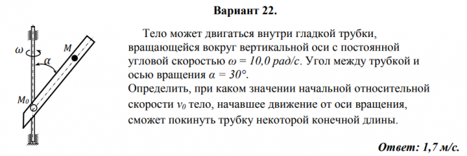 Тело может двигаться внутри гладкой трубки, вращающейся вокруг вертикальной оси с постоянной угловой скоростью ω = 10,0 рад/с. Угол между трубкой и осью вращения α = 30°. Определить, при каком значении начальной относительной скорости v0 тело, начавшее движение от оси вращения, сможет покинуть трубку некоторой конечной длины. Ответ: 1,7 м/с..