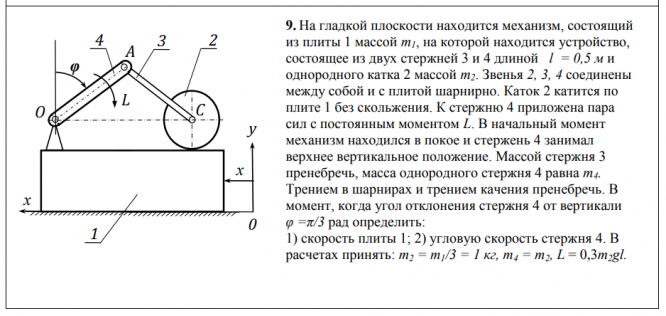9. На гладкой плоскости находится механизм, состоящий из плиты 1 массой m1, на которой находится устройство, состоящее из двух стержней 3 и 4 длиной l = 0,5 м и однородного катка 2 массой m2. Звенья 2, 3, 4 соединены между собой и с плитой шарнирно. Каток 2 катится по плите 1 без скольжения. К стержню 4 приложена пара сил с постоянным моментом L. В начальный момент механизм находился в покое и стержень 4 занимал верхнее вертикальное положение. Массой стержня 3 пренебречь, масса однородного стержня 4 равна т4. Трением в шарнирах и трением качения пренебречь. В момент, когда угол отклонения стержня 4 от вертикали φ =π/3 рад определить: 1) скорость плиты 1; 2) угловую скорость стержня 4.
