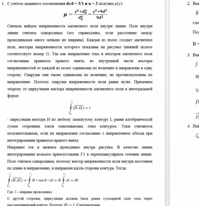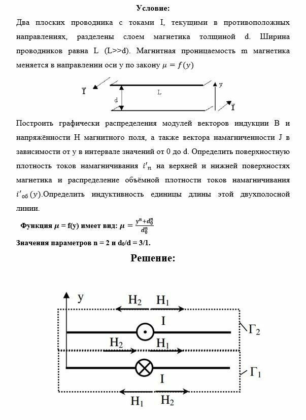 Построить графически распределения модулей векторов индукции B и напряжённости H магнитного поля, а также вектора намагниченности J в зависимости от у в интервале значений от 0 до d. Определить поверхностную плотность токов намагничивания на верхней и нижней поверхностях магнетика и распределение объёмной плотности токов намагничивания .Определить индуктивность единицы длины этой двухполосной линии.