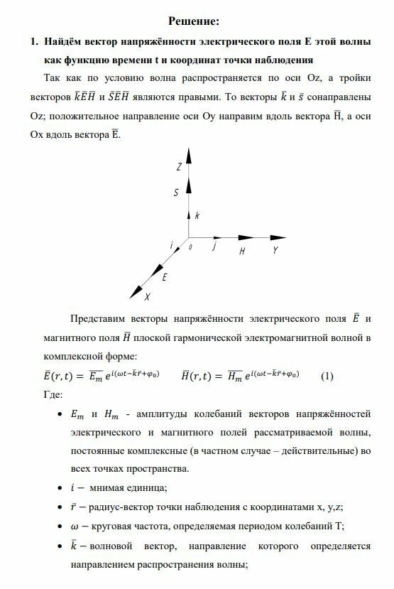 Плоская гармоническая электромагнитная волна распространяется в вакууме в положительном направлении оси Oz. Вектор плотности потока электромагнитной энергии S имеет вид: . Считая волновое число k и амплитудное значение вектора известными действительными величинами, что допустимо для однородной изотропной среды без эффектов поглощения, найти: