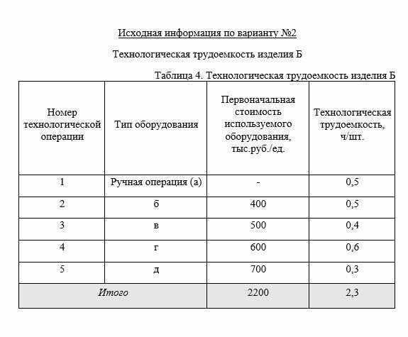 Номер технологической операции | Тип оборудования | Первоначальная стоимость используемого оборудования, тыс.руб./ед. | Технологическая трудоемкость, ч/шт. |