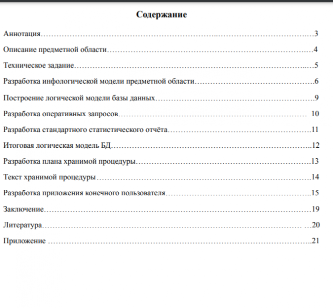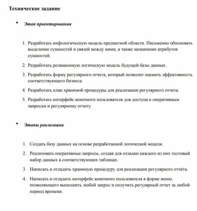 Этап проектирования 1. Разработать инфологическую модель предметной области. Письменно обосновать выделение сущностей и связей между ними, а также назначение атрибутов сущностей. 2. Разработать реляционную логическую модель будущей базы данных. 3. Разработать форму регулярного отчета, который позволит оценить эффективность соответствующего бизнеса. 4. Разработать план хранимой процедуры для реализации регулярного отчета. 5. Разработать интерфейс конечного пользователя для доступа к оперативным запросам и регулярному отчету • Этапы реализации 1. Создать базу данных на основе разработанной логической модели. 2. Реализовать оперативные запросы, создав для отладки каждого из них тестовый набор данных в соответствующих таблицах. 3. Написать и отладить хранимую процедуру для реализации регулярного отчёта. 4. Написать и отладить интерфейс конечного пользователя в форме меню, позволяющего выполнить любой запрос и получить регулярный отчет за любой период времени.