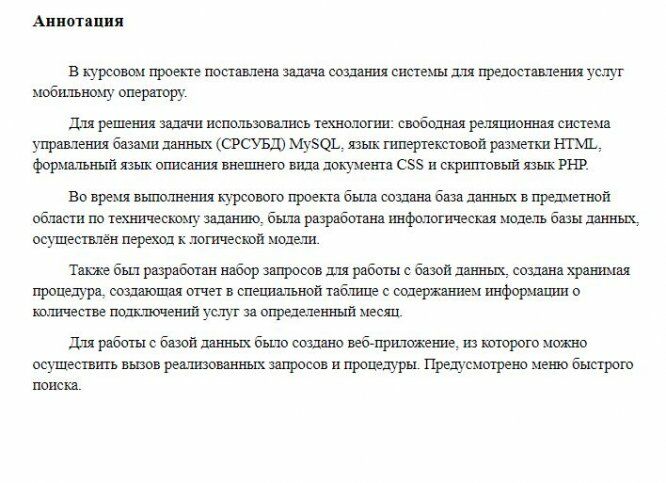 В курсовом проекте поставлена задача создания системы для предоставления услуг мобильному оператору. Для решения задачи использовались технологии: свободная реляционная система управления базами данных (СРСУБД) MySQL, язык гипертекстовой разметки HTML, формальный язык описания внешнего вида документа CSS и скриптовый язык PHP. Во время выполнения курсового проекта была создана база данных в предметной области по техническому заданию, была разработана инфологическая модель базы данных, осуществлён переход к логической модели. Также был разработан набор запросов для работы с базой данных, создана хранимая процедура, создающая отчет в специальной таблице с содержанием информации о количестве подключений услуг за определенный месяц. Для работы с базой данных было создано веб-приложение, из которого можно осуществить вызов реализованных запросов и процедуры. Предусмотрено меню быстрого поиска