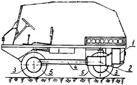 Легкий автомобиль повышенной проходимости имеет четыре ведущих колеса и предназначается для перевозки грузов до 500 кг по горным и лесным дорогам со скоростью до 58 км/час. Колесный ход автомобиля (рис. 21—1) состоит из силовой установки (двигатель 1 с маховиком) и трансмиссии, включающей муфту сцепления с коробкой передач 2, ходовой механизм 3—4 и ведущие колеса 5.