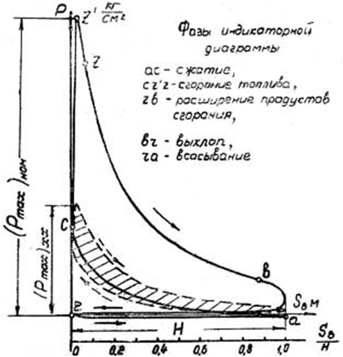 Значения давления в цилиндре двигателя в долях максимального давления Pmax в зависимости от положения поршня.