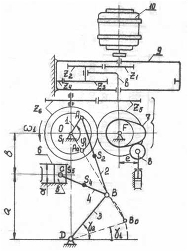 Плунжерные насосы предназначаются для перекачки различного рода жидкостей. Схема плунжерного насоса представлена на рис. 1.Привод насоса осуществляется от электродвигателя 10 через планетарный редуктор 9 и пару зубчатых колёс Z5 и Z6. C зубчатым колесом Z6 жестко связан кривошипный вал 1 (ось О), движение от которого передаётся на шатун 2, который заставляет колебаться коромысло 3 вокруг оси D. Шатун 4 передаёт движение плунжеру 5 гидравлического цилиндра 6. Шестизвенный механизм OABDС является основным механизмом плунжерного насоса. Рабочий процесс в цилиндре 6 насоса, т.е. всасывание и нагнетание жидкости, осуществляется за двойной ход плунжера 5, чему соответствует один оборот кривошипа 1.