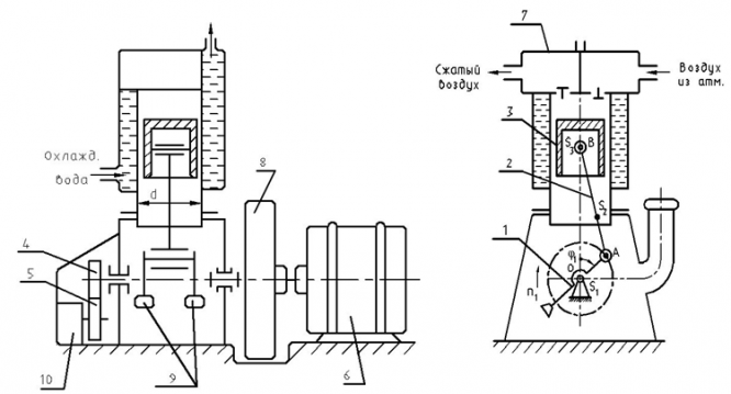 Основной механизм компрессора – кривошипно-ползунный. Он состоит из коленчатого вала 1, шатуна 2 и поршня 3. Для обеспечения необходимой равномерности движения на коленчатом валу машины закреплён маховик 8. Противовесы 9 на коленчатом валу уравновешивают механизм, уменьшая силы в подшипниках. Смазка механизма – циркуляционная, под давлением от масляного насоса 10, помещённого в картере и приводимого в движение от коленчатого вала при помощи зубчатой передачи 4-5 (рис. 1).