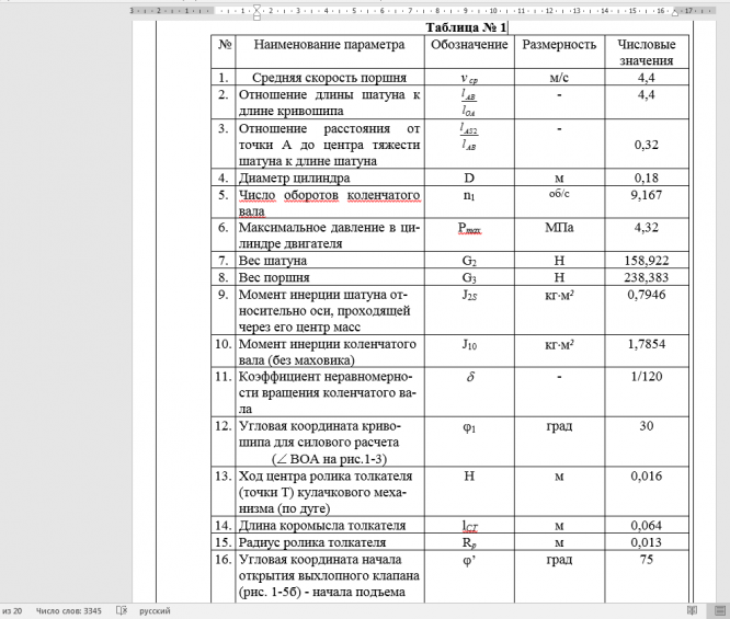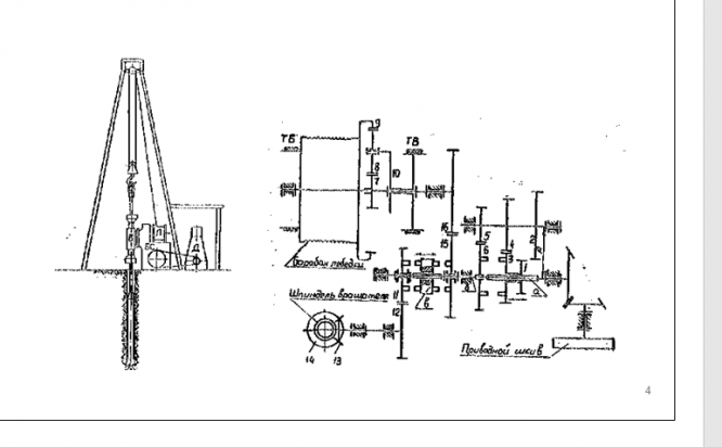 Буровая установка состоит из двигателя дизеля Д и бурового станка БС, связанных между собой клиноремённой передачей (рис. 1). При бурении движение колонны труб с буровым инструментом на конце осуществляется при помощи вращателя В, связанного с приводным шкивом станка системой зубчатых механизмов (рис. 2). Подъём бурового инструмента и труб из скважины и опускание их в скважину осуществляется при помощи лебёдки Л (рис. 1). Двигатель дизеля представляет собой одноцилиндровую, вертикальную, двухтактную машину, основным механизмом которой является кривошипно-ползунный (рис. 3). Продолжительность цикла работы двухтактного двигателя соответствует одному обороту его коленчатого вала. Изменение давления газа на поршень в процессе движения поршня представлено индикаторной диаграммой (рис. 4), данные, для построения которой приведены в табл. 2.