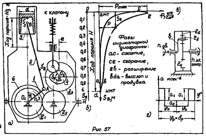 Коленчатый вал двигателя через планетарный повышающий ре­дуктор (мультипликатор) приводит во вращение вал электрогенера­тора. (Электрогенератор и редуктор на схеме 57а не показаны.)