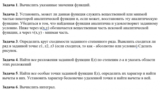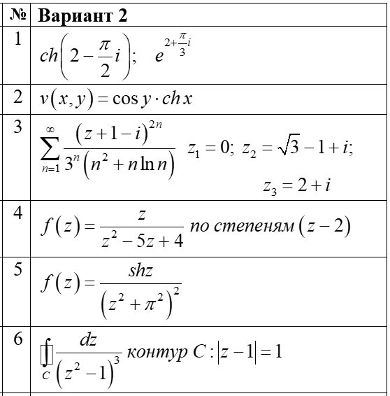 Задача 1. Вычислить указанные значения функций. Задача 2. Установить, может ли данная функция служить вещественной или мнимой частью некоторой аналитической функции и, если может, восстановить эту аналитическую функцию. Убедиться в том, что найденная функция аналитична и удовлетворяет заданному условию. Ниже через u(x,y) обозначается вещественная часть искомой аналитической функции, а через v(x,y) - мнимая часть. Задача 3. Определить круг сходимости заданного степенного ряда. Выяснить сходится ли ряд в заданной точке z1, z2, z3 (если сходится, то как - абсолютно или условно) Сделать рисунок. Задача 4. Найти все разложения заданной функции f(z) по степеням z-a и указать области этих разложений Задача 5.