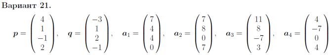 - Задача 2. Векторы p и q евклидова пространства Е4 представлены своими координатами в базисе a1, a2, a3, a4, векторы которого в свою очередь представлены своими координатами в некотором ортонормированном базисе.