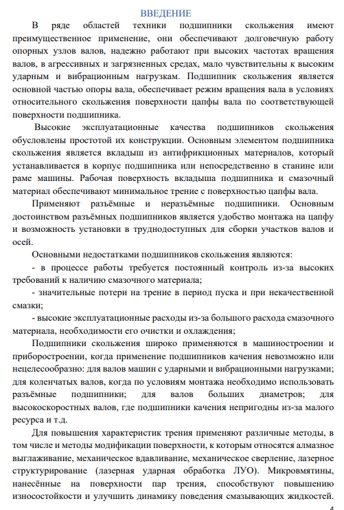 В ряде областей техники подшипники скольжения имеют преимущественное применение, они обеспечивают долговечную работу опорных узлов валов, надежно работают при высоких частотах вращения валов, в агрессивных и загрязненных средах, мало чувствительны к высоким ударным и вибрационным нагрузкам. Подшипник скольжения является основной частью опоры вала, обеспечивает режим вращения вала в условиях относительного скольжения поверхности цапфы вала по соответствующей поверхности подшипника. Высокие эксплуатационные качества подшипников скольжения обусловлены простотой их конструкции. Основным элементом подшипника скольжения является вкладыш из антифрикционных материалов, который устанавливается в корпус подшипника или непосредственно в станине или раме машины. Рабочая поверхность вкладыша подшипника и смазочный материал обеспечивают минимальное трение с поверхностью цапфы вала. Применяют разъёмные и неразъёмные подшипники. Основным достоинством разъёмных подшипников является удобство монтажа на цапфу и возможность установки в труднодоступных для сборки участков валов и осей