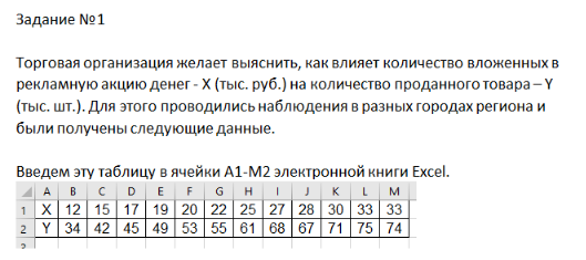 Торговая организация желает выяснить, как влияет количество вложенных в рекламную акцию денег - X (тыс. руб.) на количество проданного товара – Y (тыс. шт.). Для этого проводились наблюдения в разных городах региона и были получены следующие данные.
