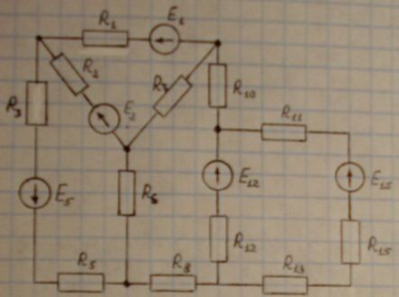 E5 = 18 В; E12 = 40 В; E15 = 11 В; R1 = 40 Ом; R2 = 7 Ом; R3 = 20 Ом; R5 = 16 Ом; R6 = 5 Ом; R7 = 3 Ом; R8 = 22 Ом; R10 = 24 Ом; R11 = 9 Ом; R12 = 21 Ом; R13 = 53 Ом; R15 = 12 Ом.